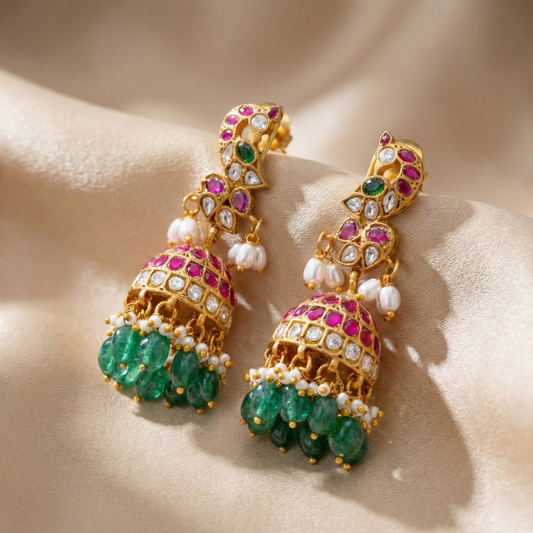 Peacock ruby emerald kundan jhumkas