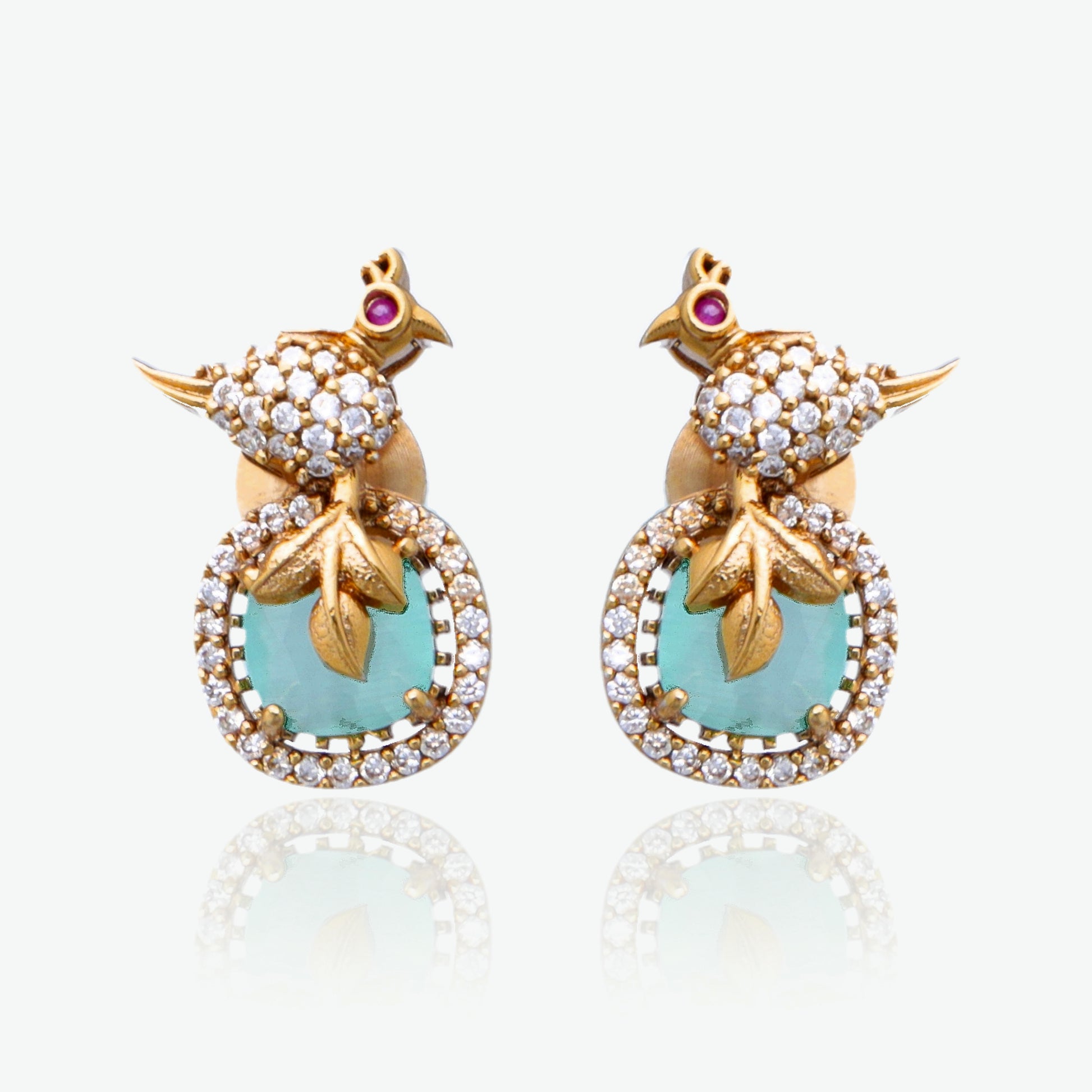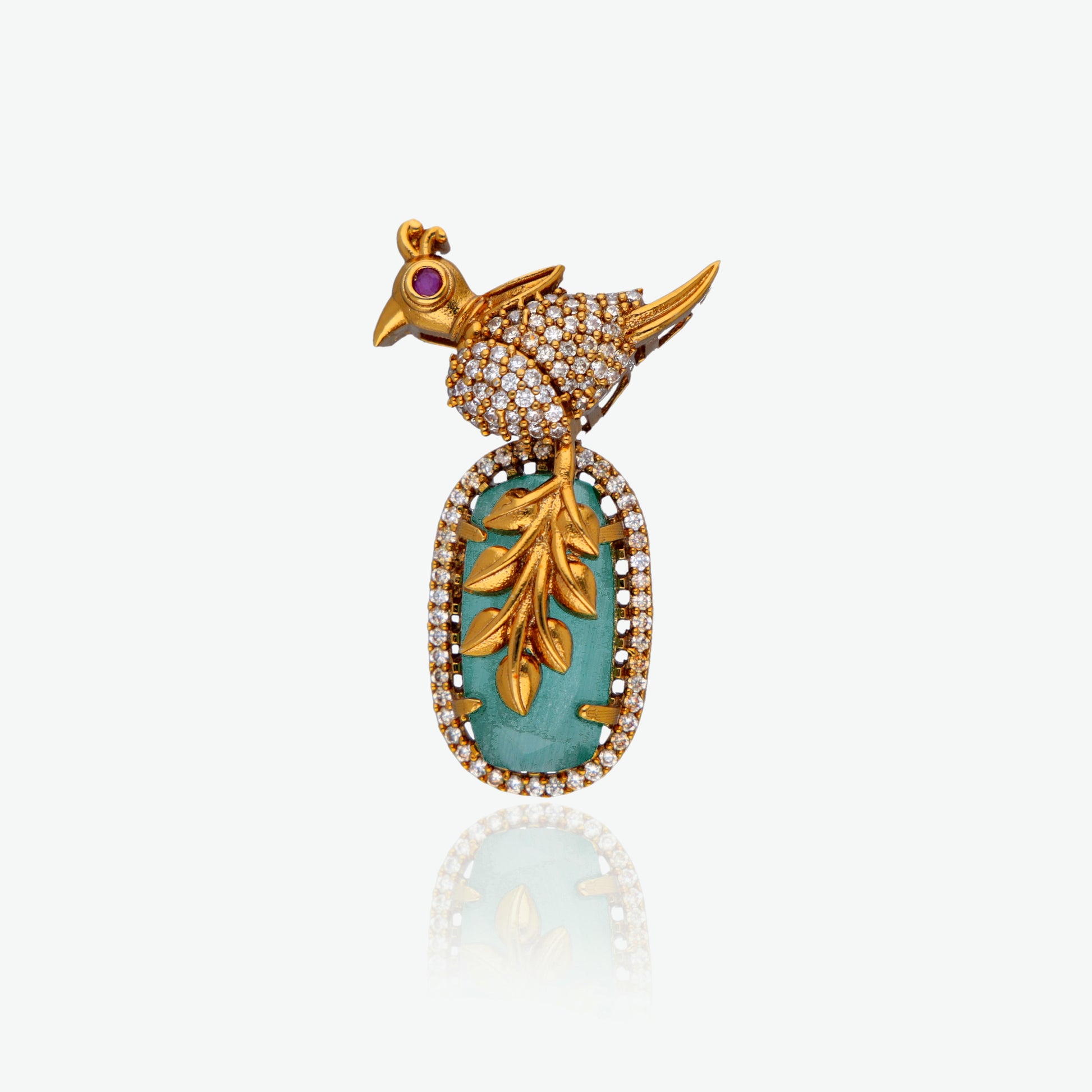 Add a whimsical touch of nature-inspired elegance to your jewelry collection with this stunning bird motif pendant set. The pendant features a sparkling gold bird perched atop a soft mint green stone, framed with shimmering white stones and adorned with intricate gold leaf detailing. The design balances traditional craftsmanship with a fresh, artistic aesthetic.