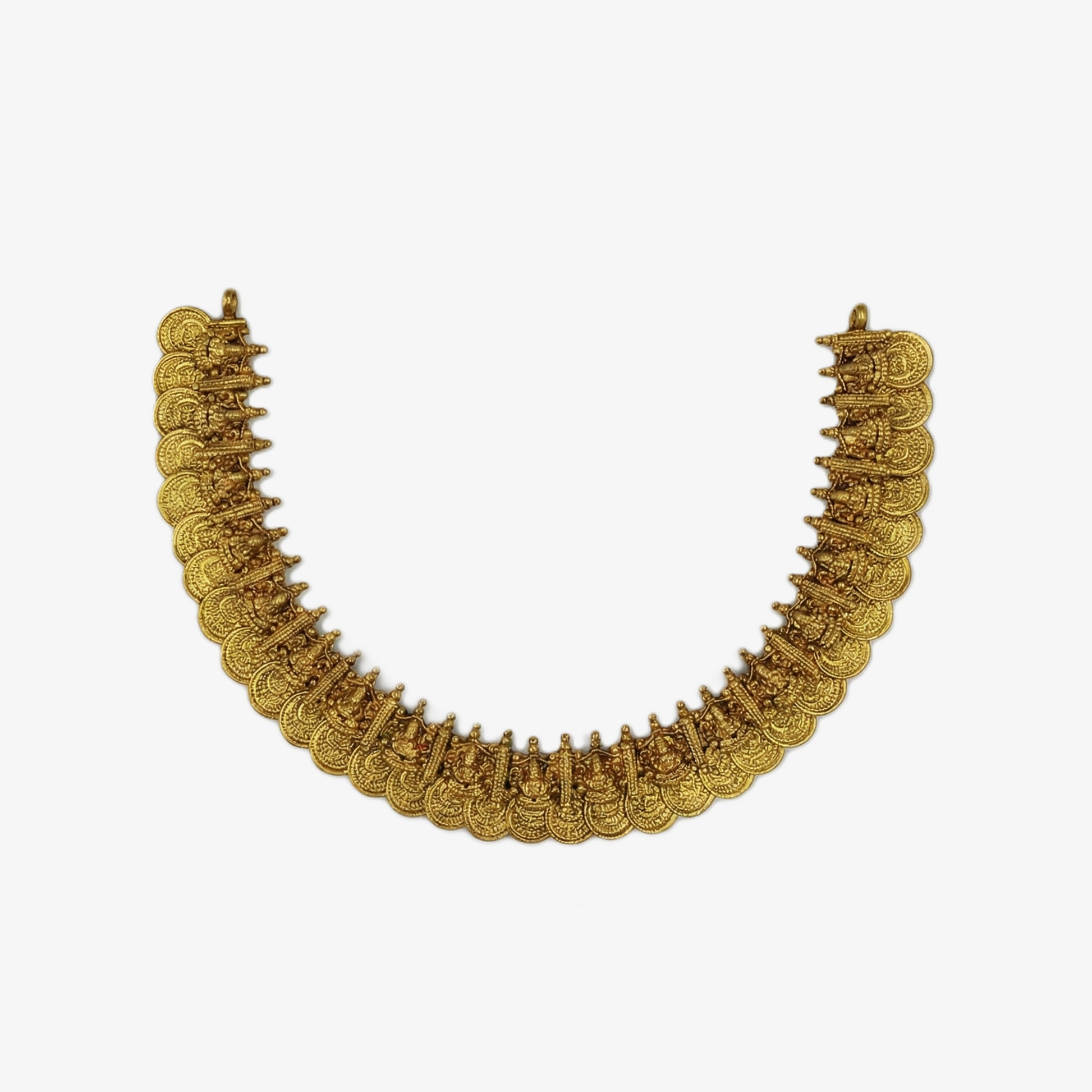 This all gold tone temple necklace is crafted with dense rows of embossed Lakshmi coin motifs, creating a rich, antique finish that instantly frames the neckline. Best paired with silk sarees or traditional half sarees for weddings, engagement ceremonies, and temple festivals when you want a powerful yet classic statement piece.