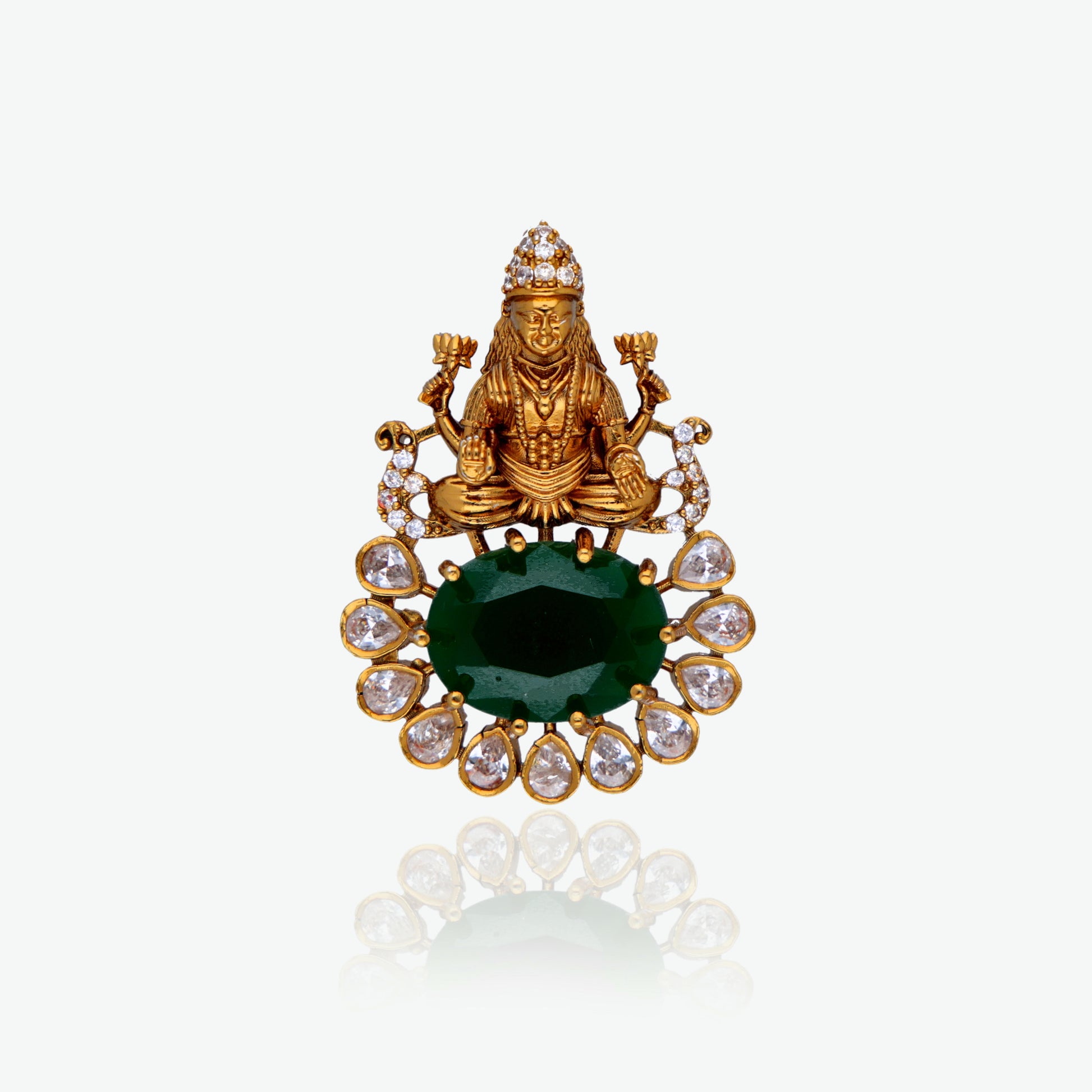 The matching earrings replicate the same design—each showcasing the Lakshmi figure atop a deep green center stone, encircled by radiant CZs, offering a perfect balance of devotion and glamour.