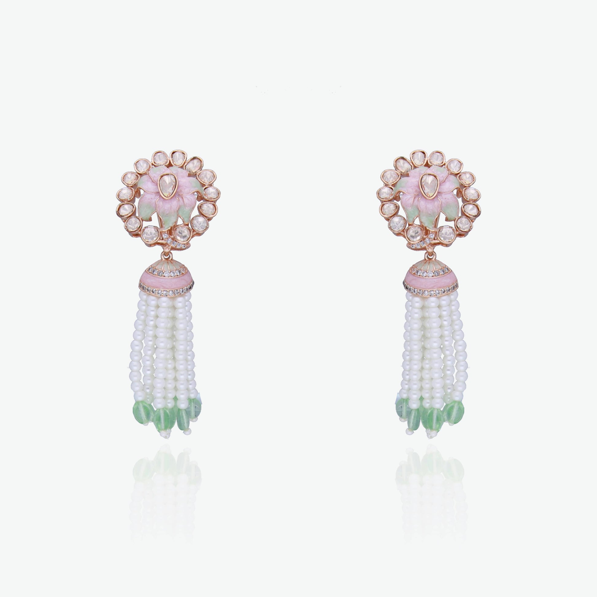 A hand-carved lotus motif in blush-to-mint forms the stud, wreathed in shimmering polki-style crystals that echo classic Jaipur jadau artistry. A pink enamel dome tip gives way to fluid tassels of lustrous seed pearls, each strand ending in cool mint-green beads. The pastel palette and joyful movement marry Mughal-era elegance with today’s pastel-maximalist trend.