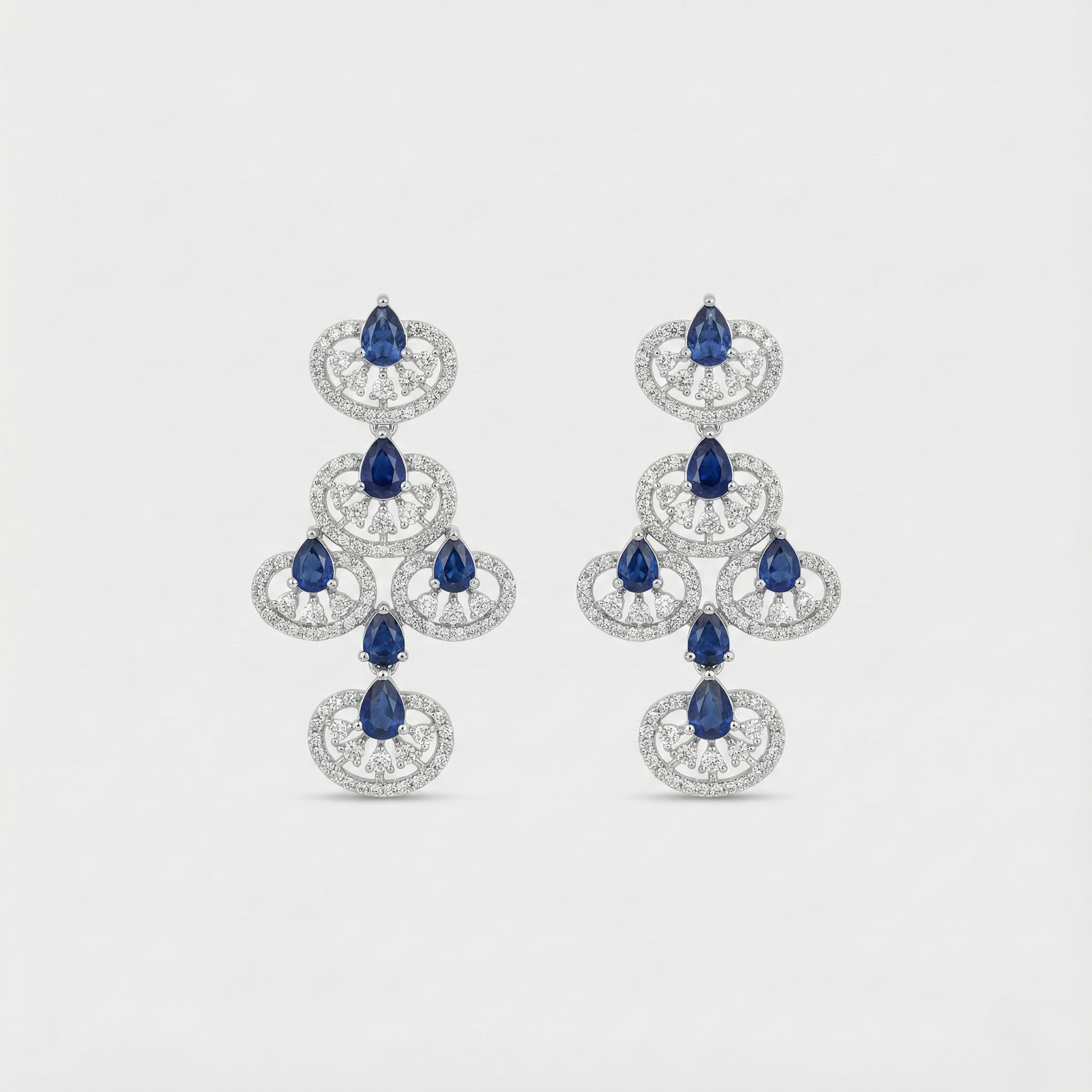 This white rhodium finish necklace and earrings set showcases layered circular motifs studded with CZs and rich navy blue pear shaped stones, creating a cascading, red carpet sparkle. Ideal for receptions, cocktail parties, and black tie evenings, it pairs best with deep jewel toned gowns or modern saris for a glamorous, high impact look.