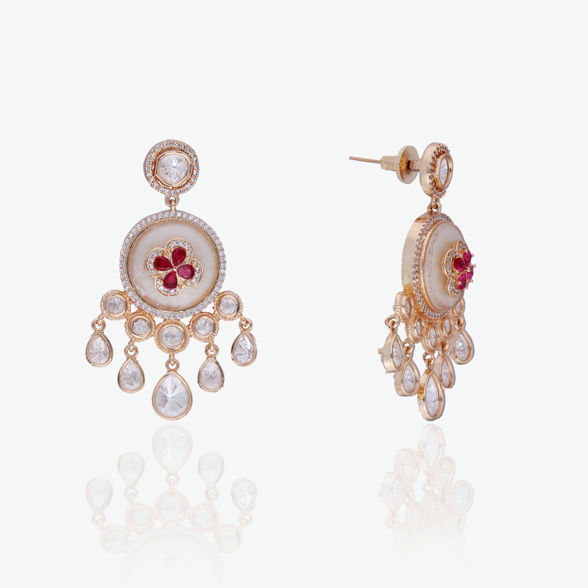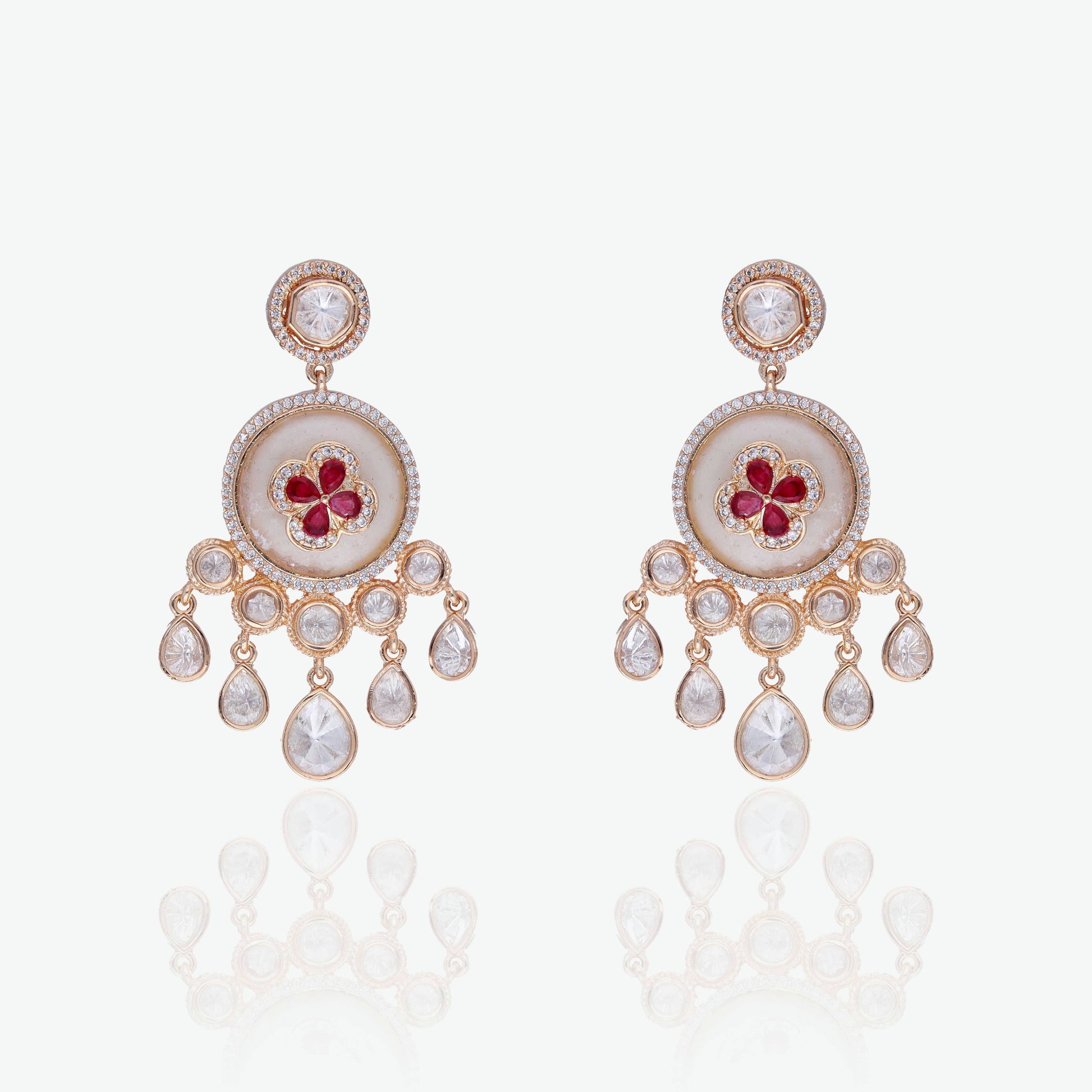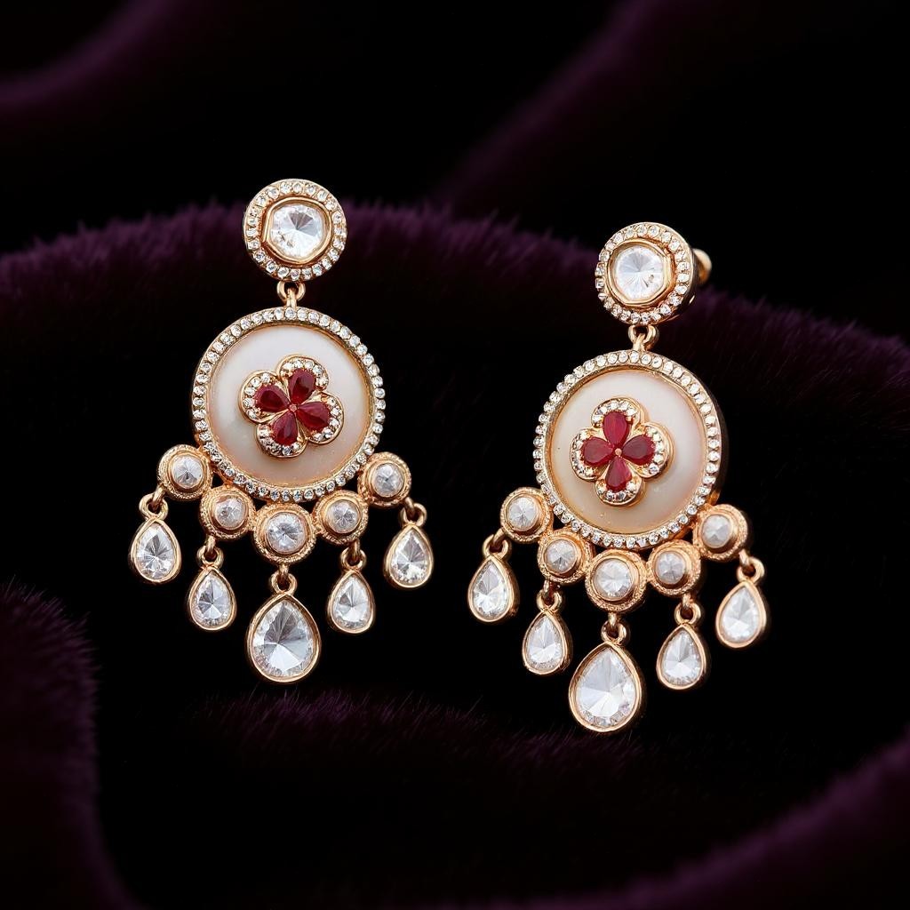 These elegant earrings blend traditional charm with high-shine brilliance. The design showcases a moissanite-studded frame with a ruby-toned floral motif at the center. Moissanite drops add graceful movement and sparkle, making them ideal for bridal styling or grand celebrations.
