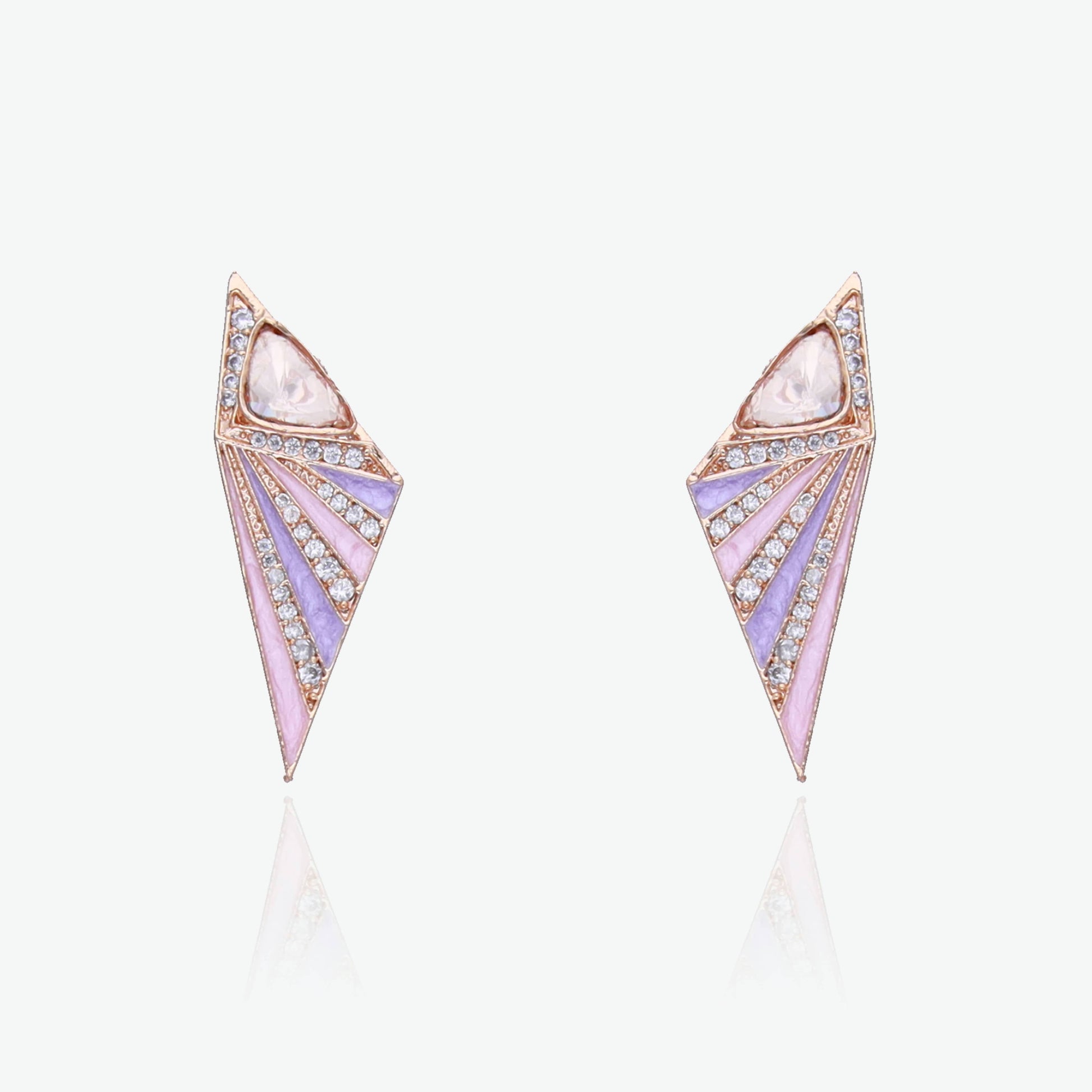 Make a stylish statement with these modern geometric studs. Designed with a bold angular silhouette, the earrings feature a striking combination of lavender and blush pink enamel inlays, highlighted by glittering stone lines and a clear faceted topper. With a gold finish that complements the pastel tones, they’re perfect for festive fusion looks or minimal glam styling.