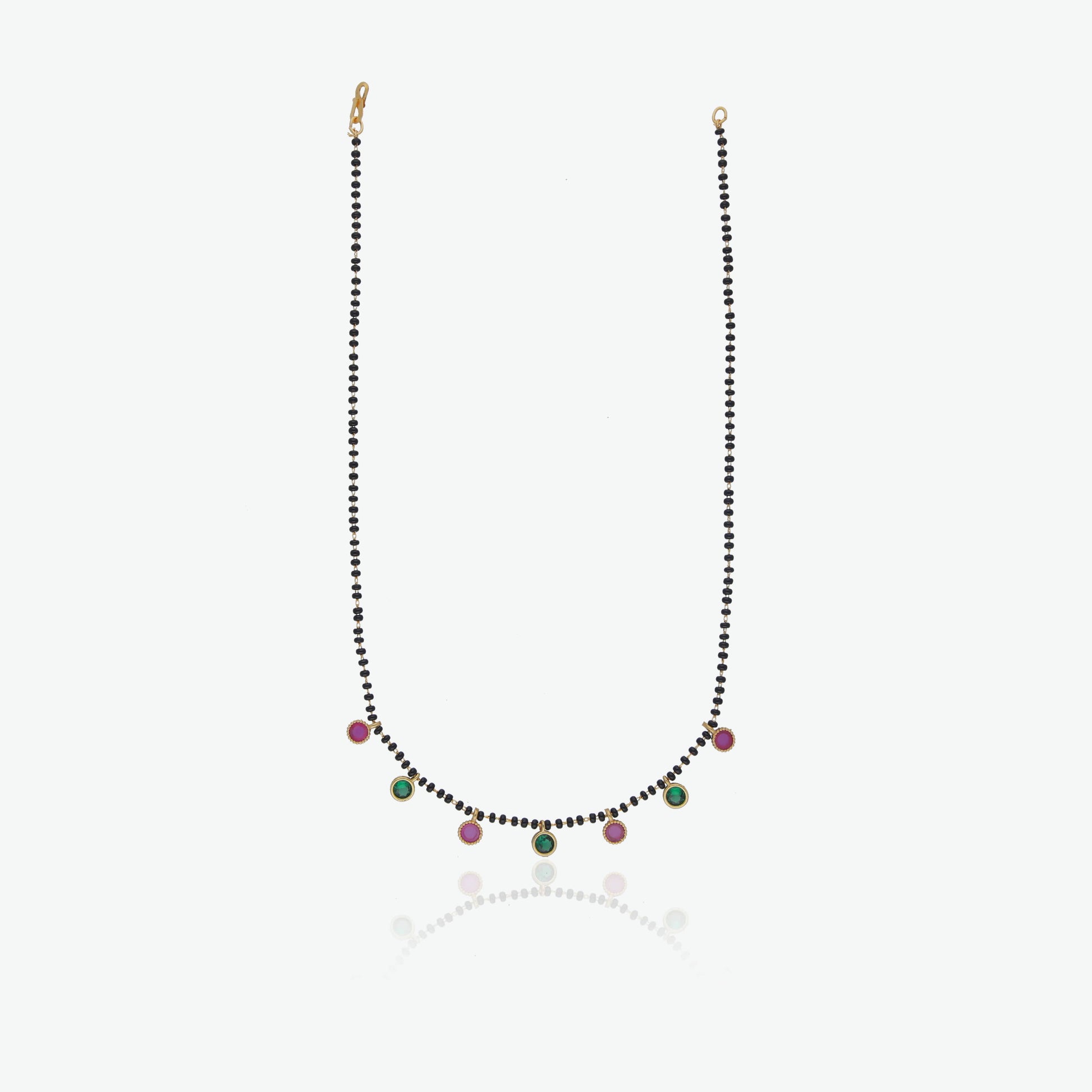 Crafted with a single-line black bead chain, it features alternating pink and green round stones set in a minimal gold-tone frame. Lightweight yet striking, it offers the perfect mix of tradition and trend.