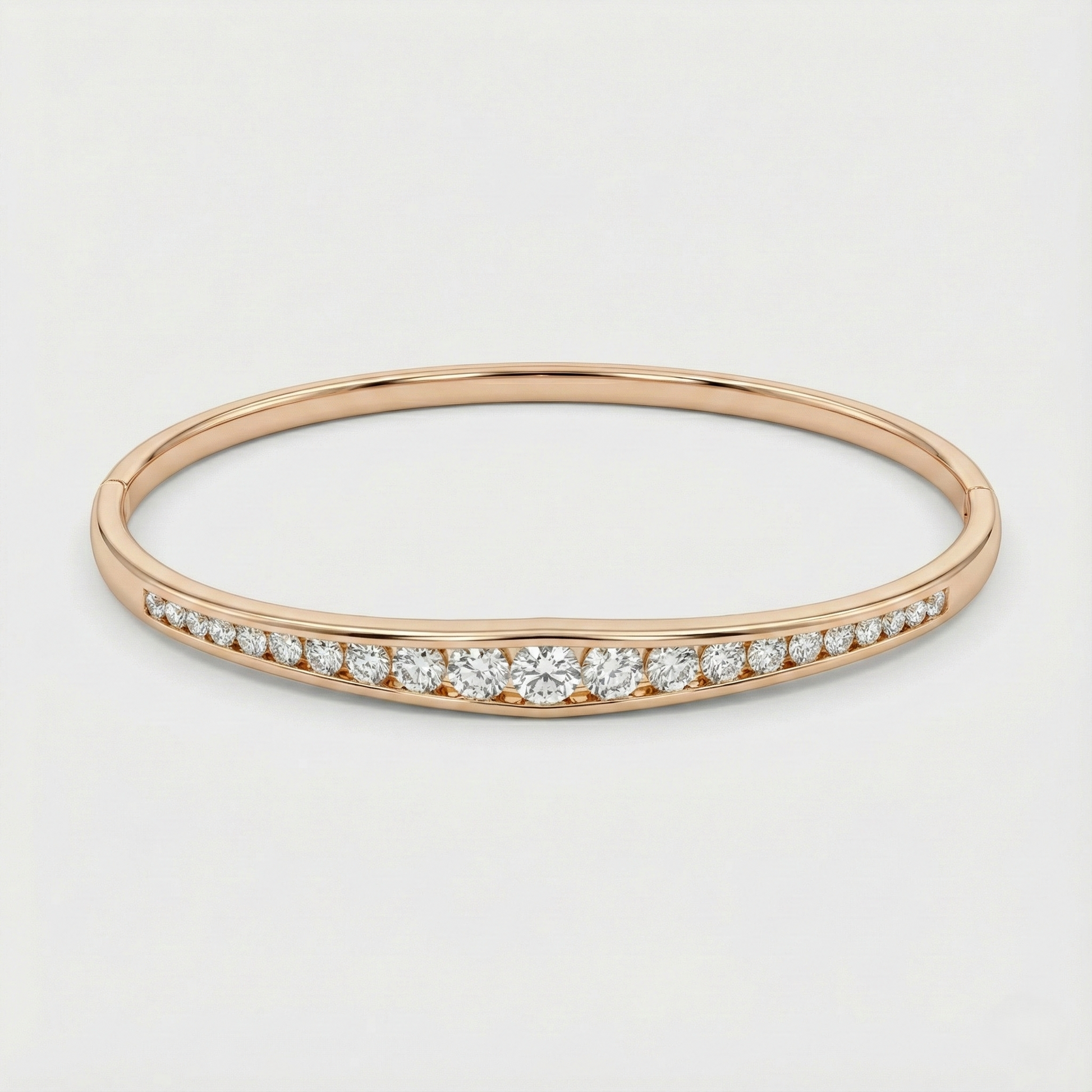 A slim rose gold tone bracelet features a single channel style line of crystals that subtly graduates into larger stones at the center, creating a refined spotlight sparkle. It’s perfect for everyday elegance workwear, brunch, or family functions and layers beautifully with a delicate chain bracelet or a minimal watch.