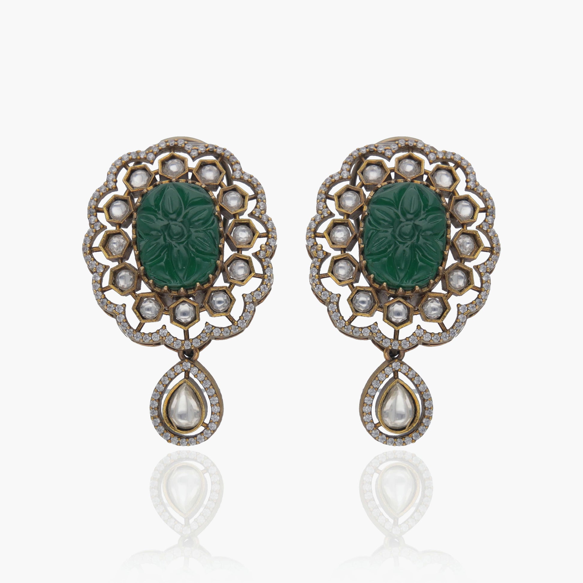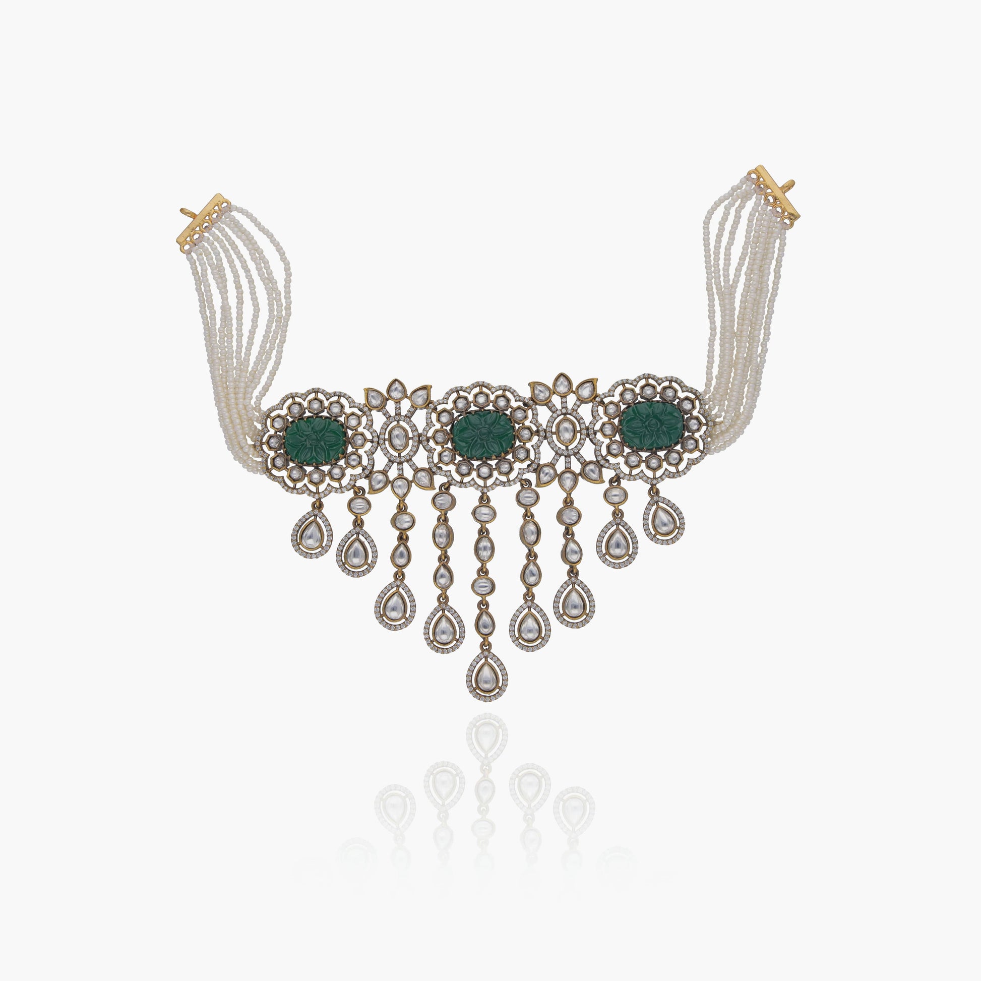 Command attention with this majestic emerald choker set, designed for grand celebrations and bridal elegance. The centerpiece boasts intricately arranged oval green stones framed by sparkling crystal accents and tear-drop shaped embellishments that cascade gracefully down the neckline. Complemented by multi-strand pearl-style chains on each side, the design strikes a beautiful balance between heritage craftsmanship and contemporary charm.