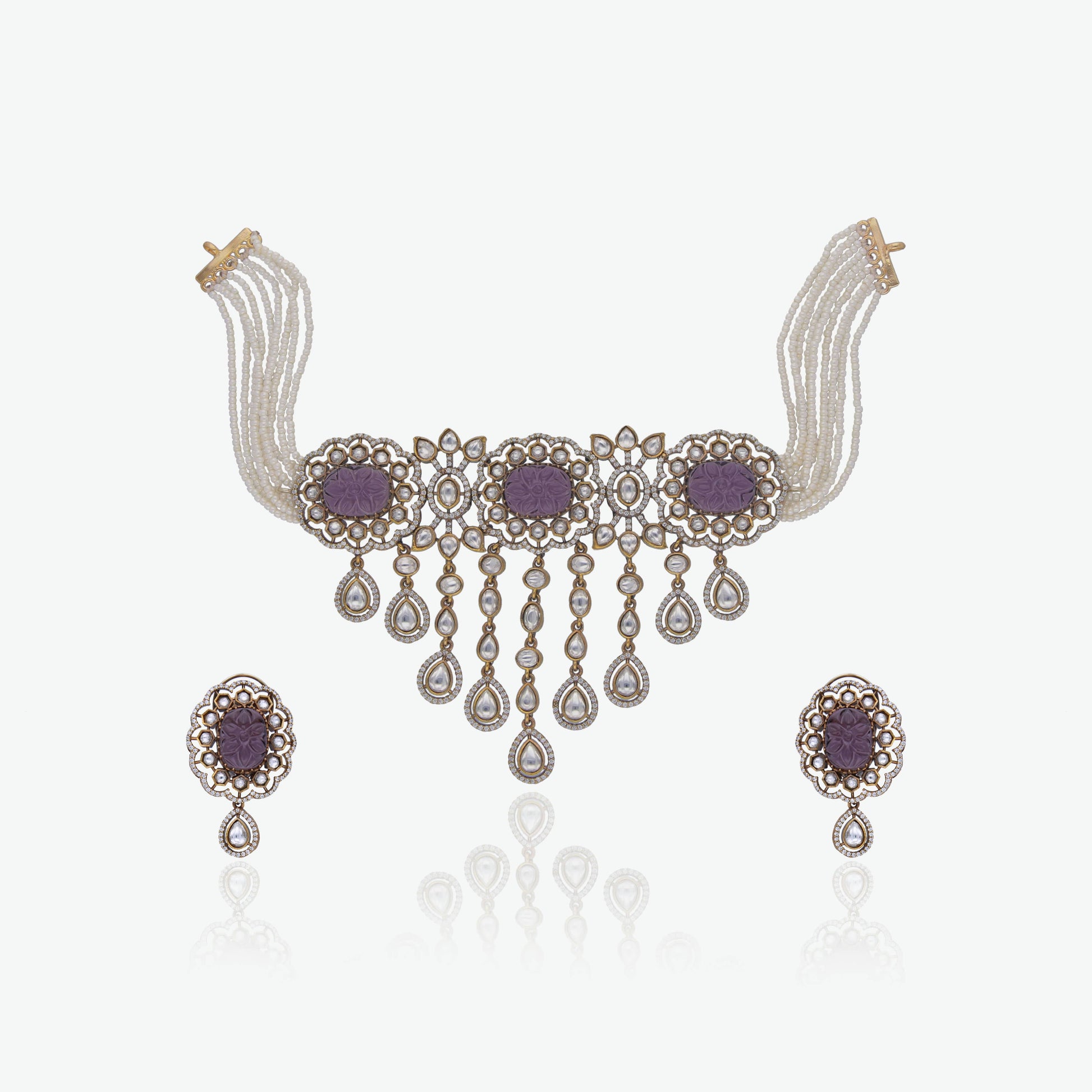 The set includes matching earrings that mirror the intricate motifs of the choker, making it a complete showstopper ensemble.