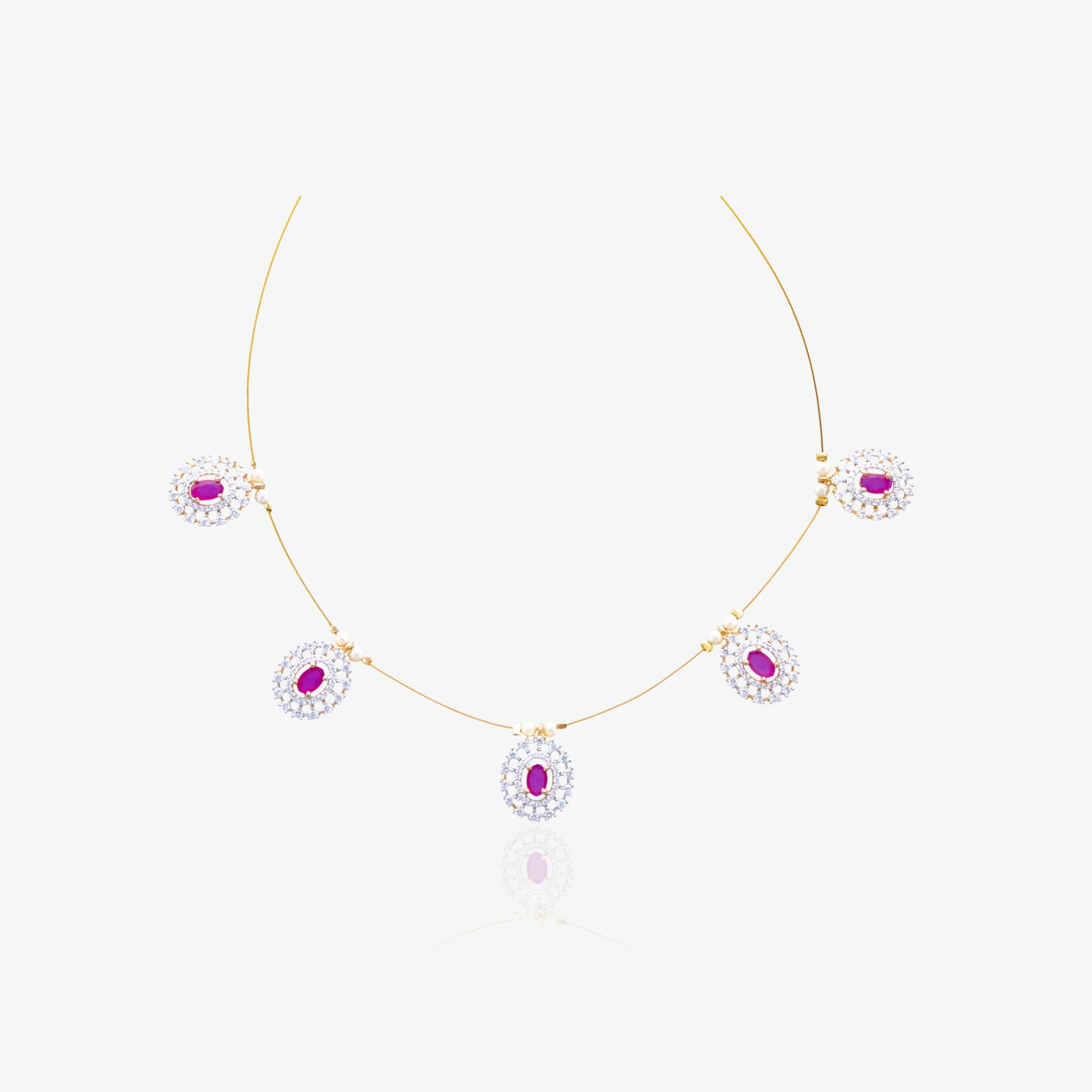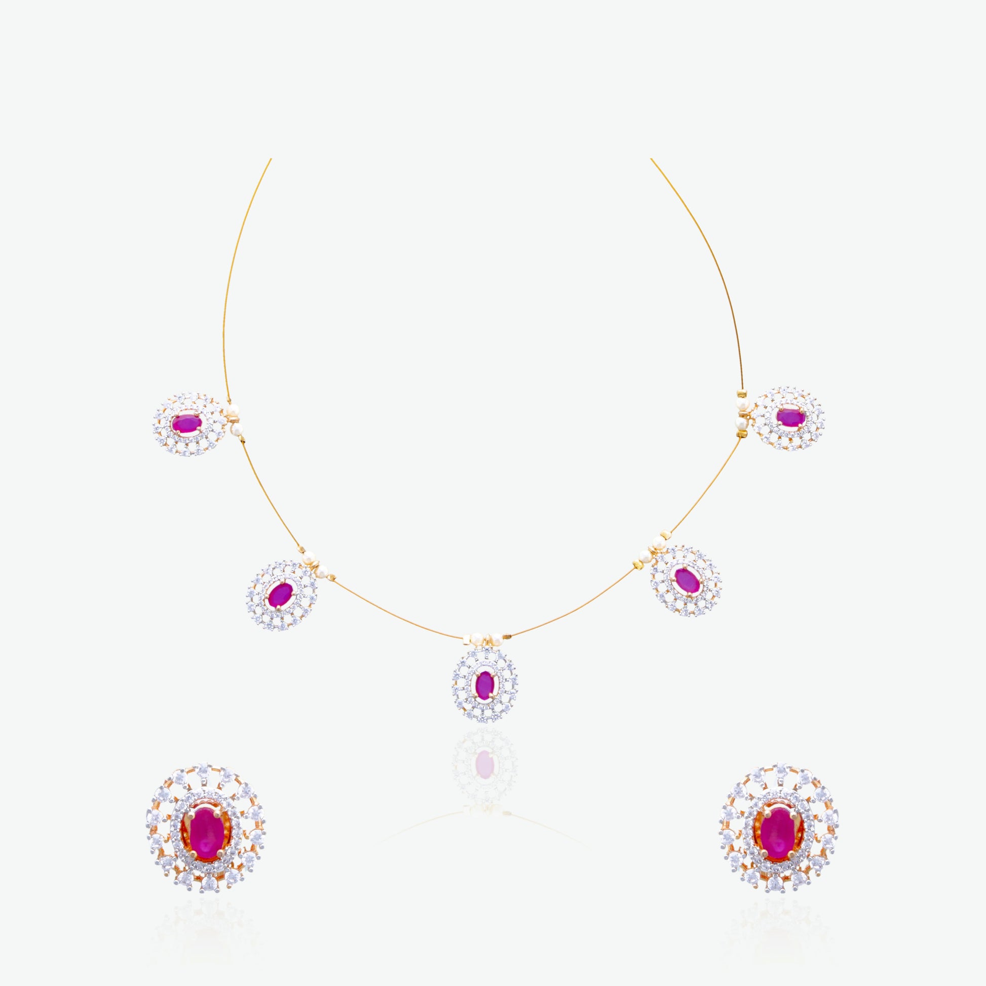 Add a touch of refined elegance to your look with this stunning Ruby Pink Invisible Chain Necklace Set. Featuring a delicate transparent string that creates a floating effect, the necklace showcases oval-shaped ruby pink stones framed by dazzling white crystals. The matching earrings mirror the same timeless design, offering a coordinated and graceful finish.